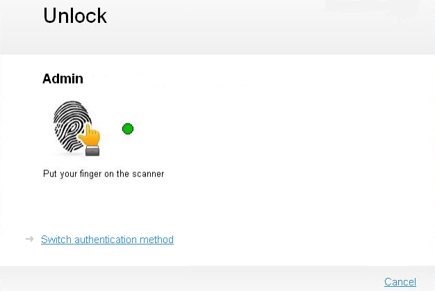 When you first log in to the system or to the app via Axidian authentication, select the login method by clicking Switch authentication Method on the Windows login screen (on the Authentication screen if you use Enterprise SSO). Select Finger as a login method.