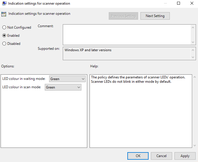 The policy defines the parameters of scanner LEDs operation. Scanner LEDs do not blink in either mode, by default.