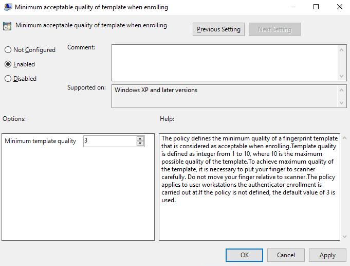 The Minimum acceptable quality of template when enrolling policy defines the minimum quality of a fingerprint template that is considered as acceptable when enrolling. Template quality is defined as an integer from 1 to 10, where 10 is the maximum possible quality of the template. To achieve maximum quality of the template, place your finger on a scanner carefully. Do not move your finger relative to a scanner. Define the policy at the system clients, where authenticator enrollment is carried out. In other words, these are user workstations with the client components of the system installed. If the policy is not defined, the default value 3 is used.