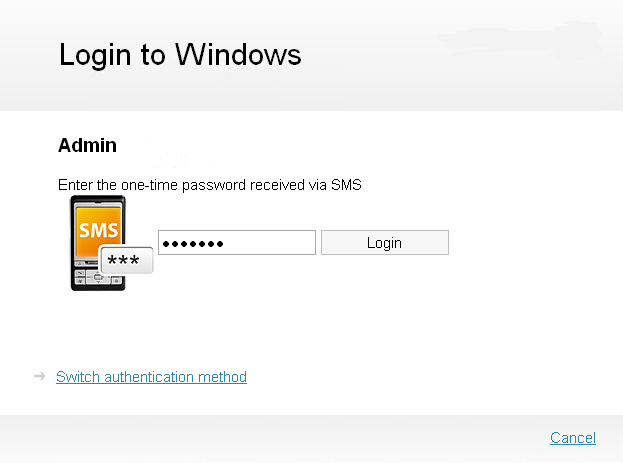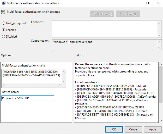 The Windows Logon component and the provider chain Passcode + SMS OTP are used in the following example.