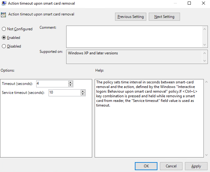 The Windows Logon® policy determines the duration of the standard and service timeout following the removal of an authentication device. Use this policy to set the time period (in seconds) between the removal of a smart card and the performance of action together with the Windows policy − Interactive logon: Smart card enhanced removal behavior. Standard timeout option prevents automatic system lockout in case of accidental removal of an authentication device.