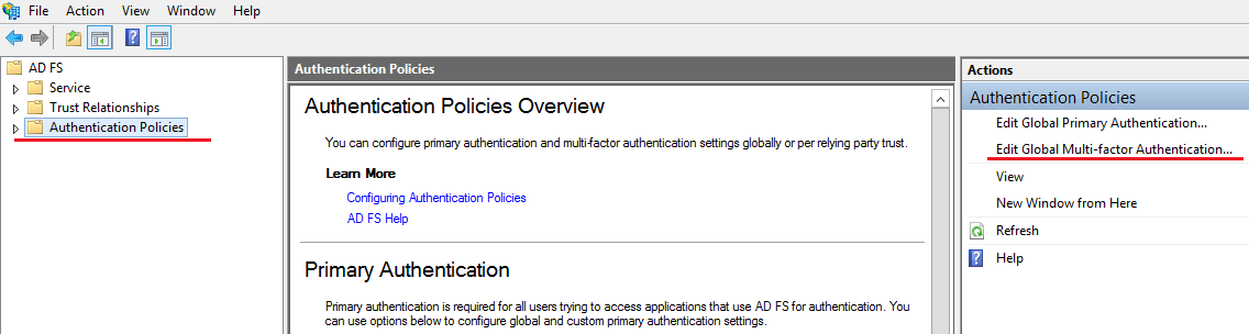 - Select Authentication Policies and in the Actions window, select Edit Global Multi-factor Authentication.