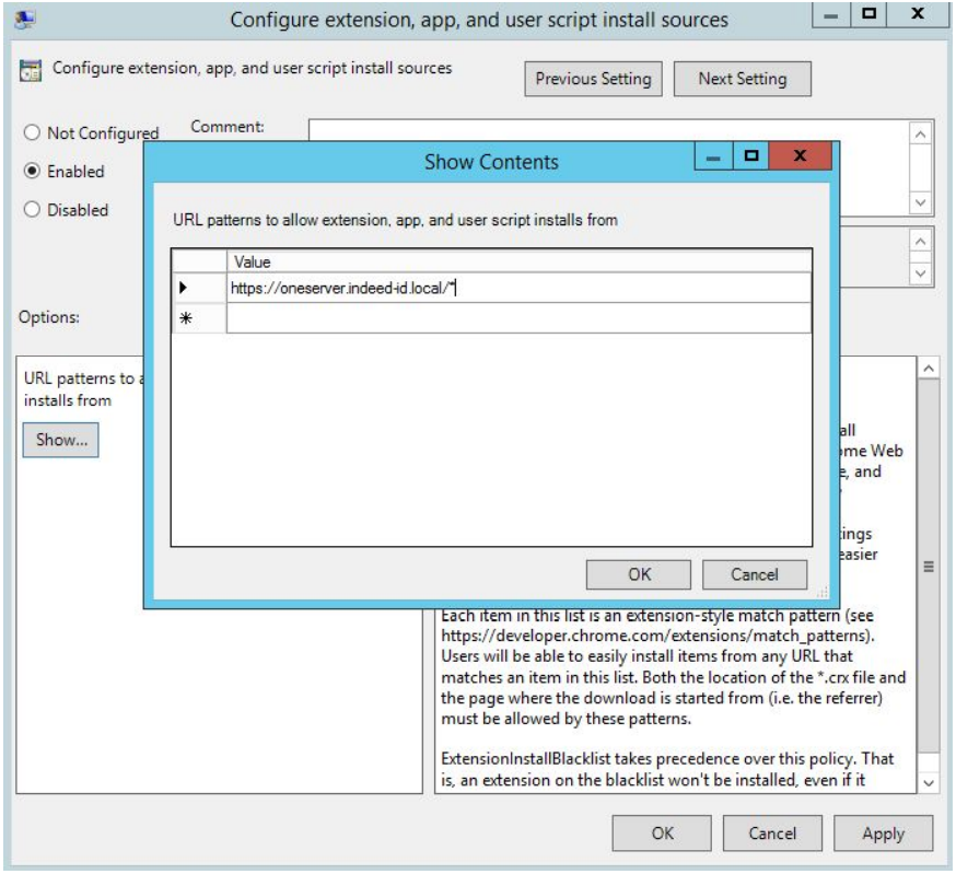 Enable the Configure extension, app, and user script install sources policy and indicate the address of the server, where the