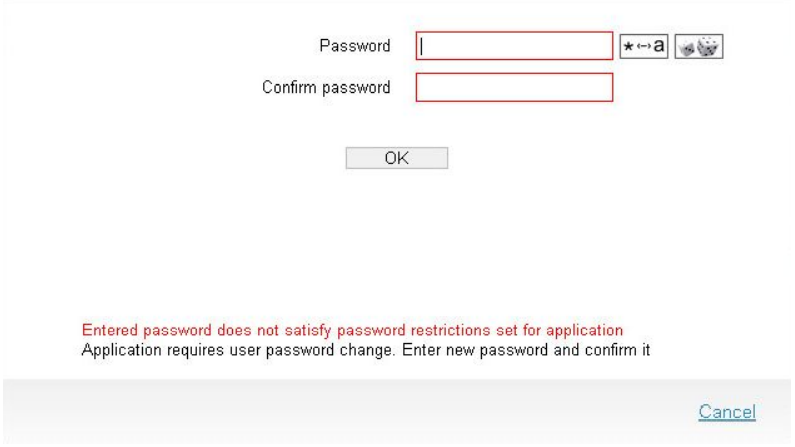 The new password entered in the standard manner is checked for compliance with password security criteria set for the application. An error message appears, if the password does not comply with the required criteria.