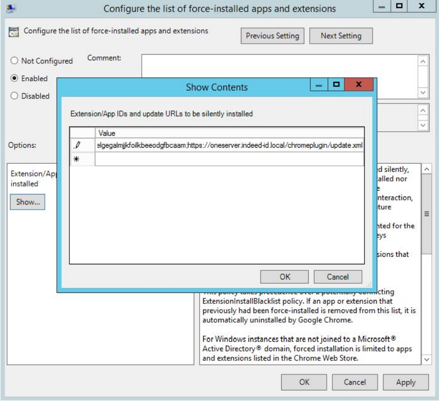 Enable the Configure the list of force-installed apps and extensions policy and define the application identifier (indicated in the .crx file name) and path to the .xml file in the folder of