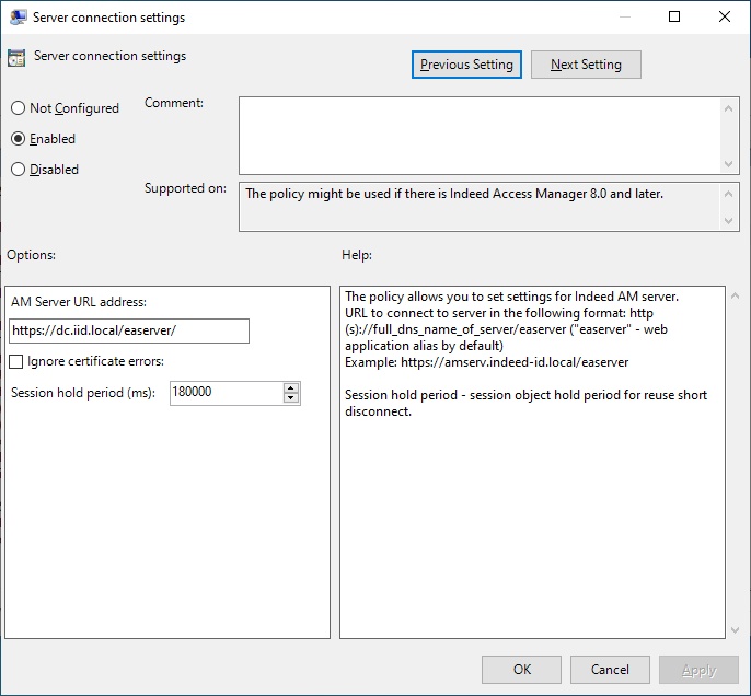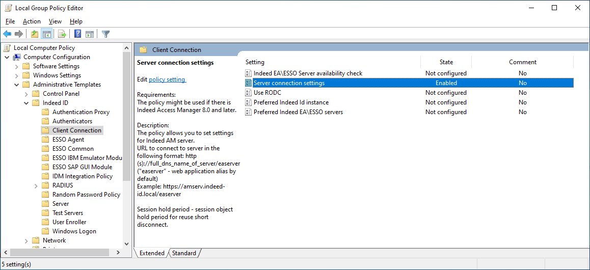 Open gpedit.msc and navigate to Computer Configuration - Administrative templates - Axidian ID - Client Connection - Server connection settings.