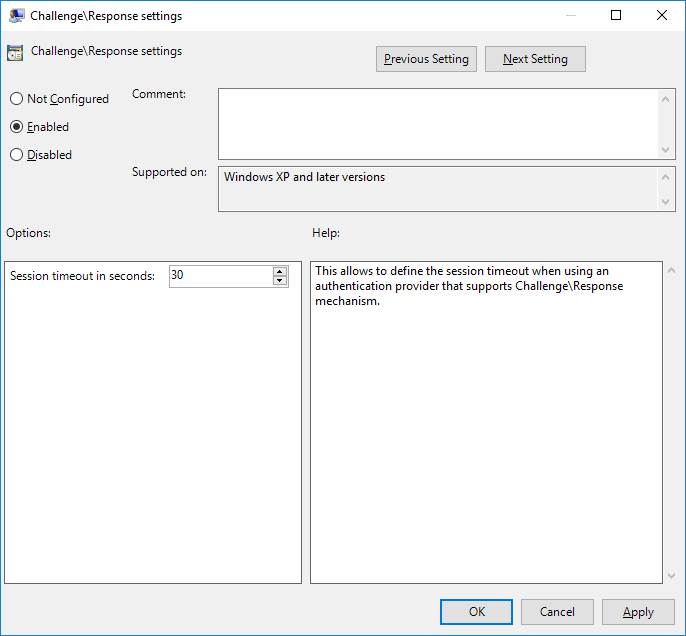 This setting allows you to define the session timeout when using an authentication provider that supports Challenge\Response mechanism.
