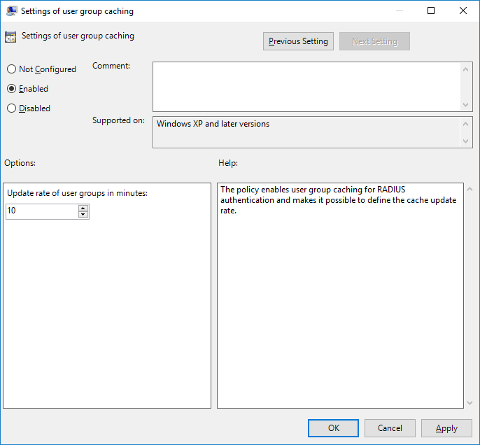 The policy enables user group caching for RADIUS authentication and makes it possible to define the cache update rate.