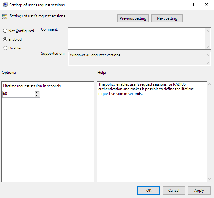 The policy enables user's request sessions for RADIUS authentication and makes it possible to define the lifetime request session in seconds.
