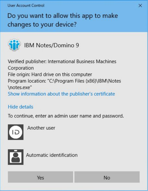 The Run as administrator standard command includes the authentication request using Axidian Access technology. When you run this command, the user account selection window appears, followed by the Authentication window of the Axidian Access system. The user account selection window may vary depending on the operating system version. The following example shows this window for Windows 10.