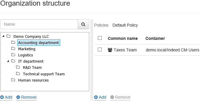 To add objects to a node, select Add in the right pane of the organization structure editing window. The structure is built using user catalog objects.