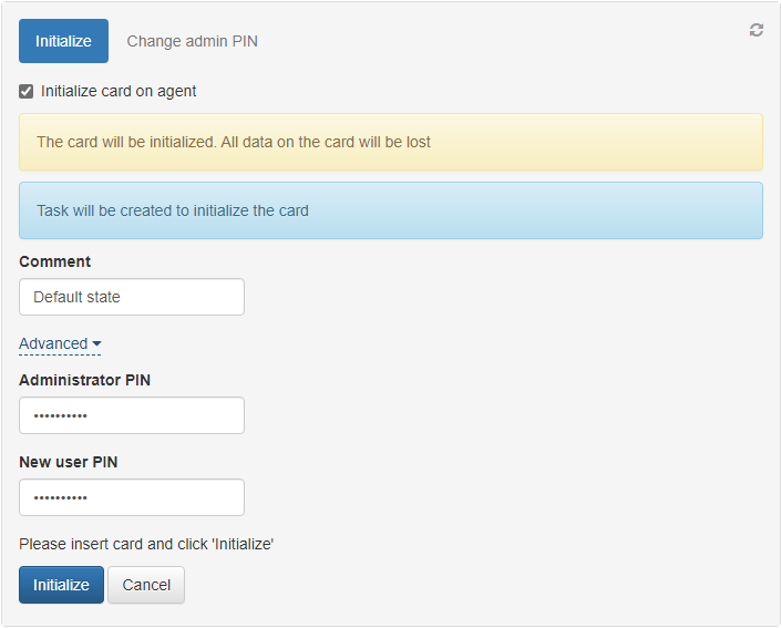 • If the administrator PIN on the card does not match the one stored in the sAxidian CertiFlow database, enter the correct PIN in the Advanced section. Optionally, set a New user PIN and then click Initialize. The administrator PIN in the databse is updated to the value you provided.
