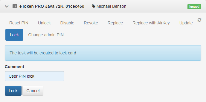 • Lock user PIN: Locks the user PIN. Assign this task to cards in Issued or Pending status.