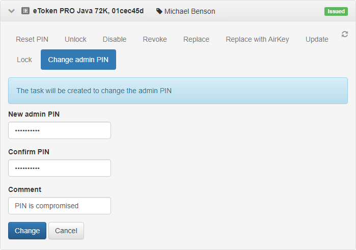 • Change admin PIN: Changes the administrator PIN. You can assign this task to card in any status.