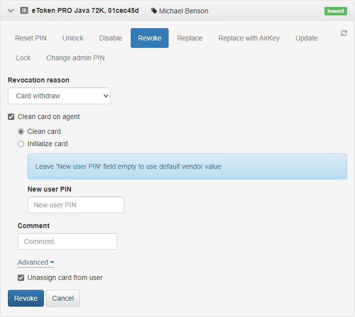 3. To unassign the card from the user, click Advanced and enable the Unassign card from user option. If this option is disabled, the card remains assigned to the user.