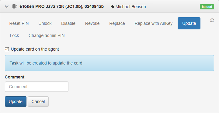• Update card: Updates the card contents. Assign this task to card in Issued status.